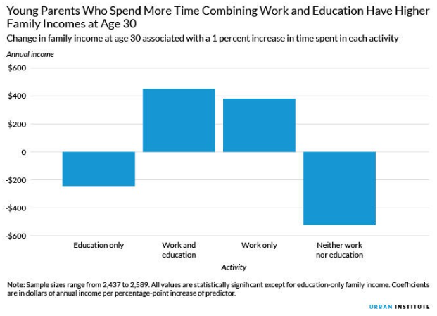“For young parents in work and school, more time spent in both activities can mean higher earnings in future years. Urban research shows that each 1 percent increase in parents’ time spent combining work and education is associated with a $451 bump in annual family income at age 30 (although there are other factors at play).”